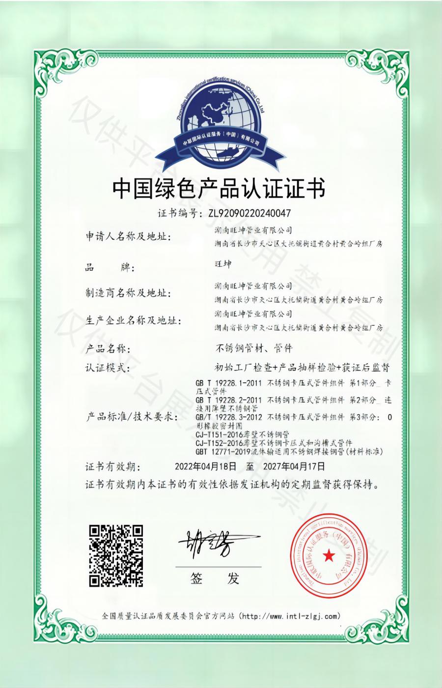 中國綠色產品認證證書