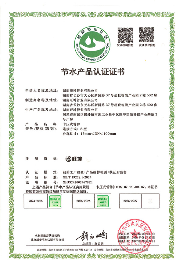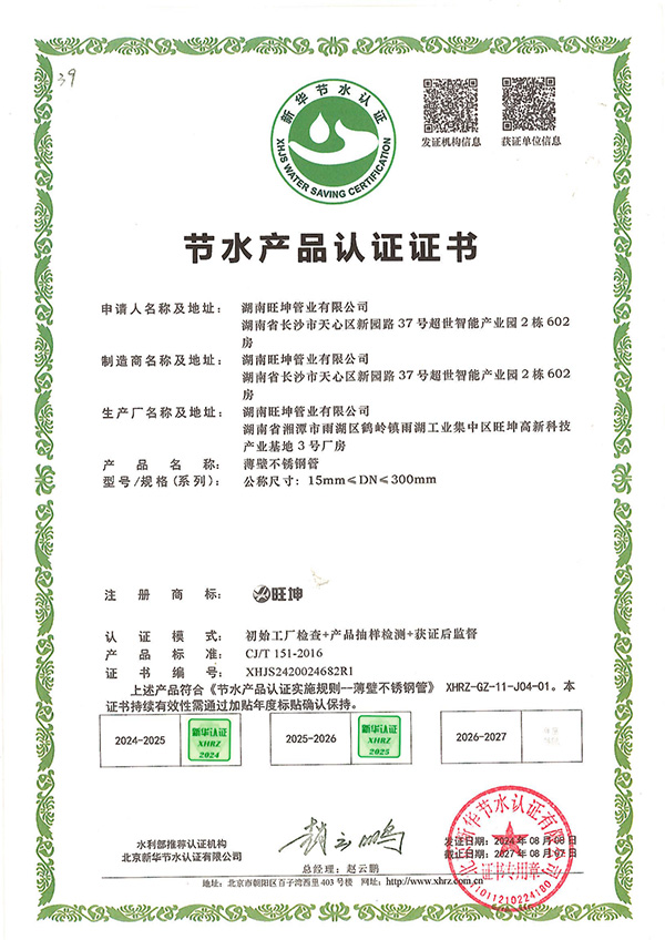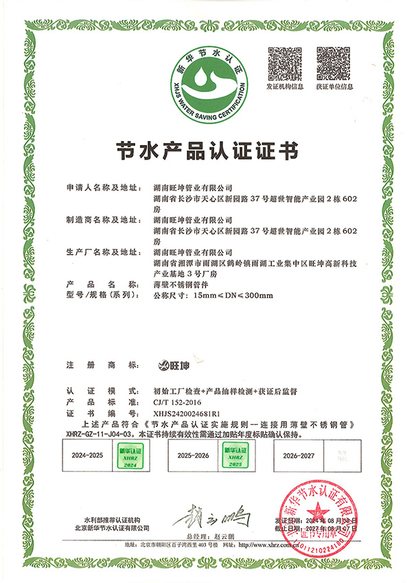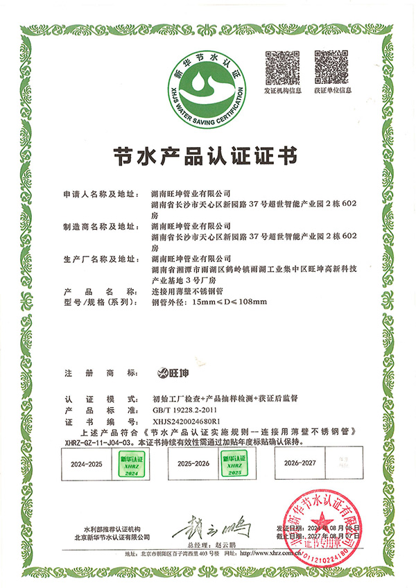 節水認證是由國家水利部推薦、經權威認證機構嚴格審核後頒發的權威資質。此次認證由北京新華節水認證有限公司執行,對湖南麻豆精品免费视频管業生產的薄壁不鏽鋼管、連接用薄壁不鏽鋼管、卡壓式管件及薄壁不鏽鋼管件(公稱尺寸15mm至300mm全係列)進行了全麵評估。認證模式涵蓋了嚴格的初始工廠檢查、產品抽樣檢測及獲證後監督,確保產品完全符合 CJ/T 151-2016 行業標準及《節水產品認證實施規則》的要求。